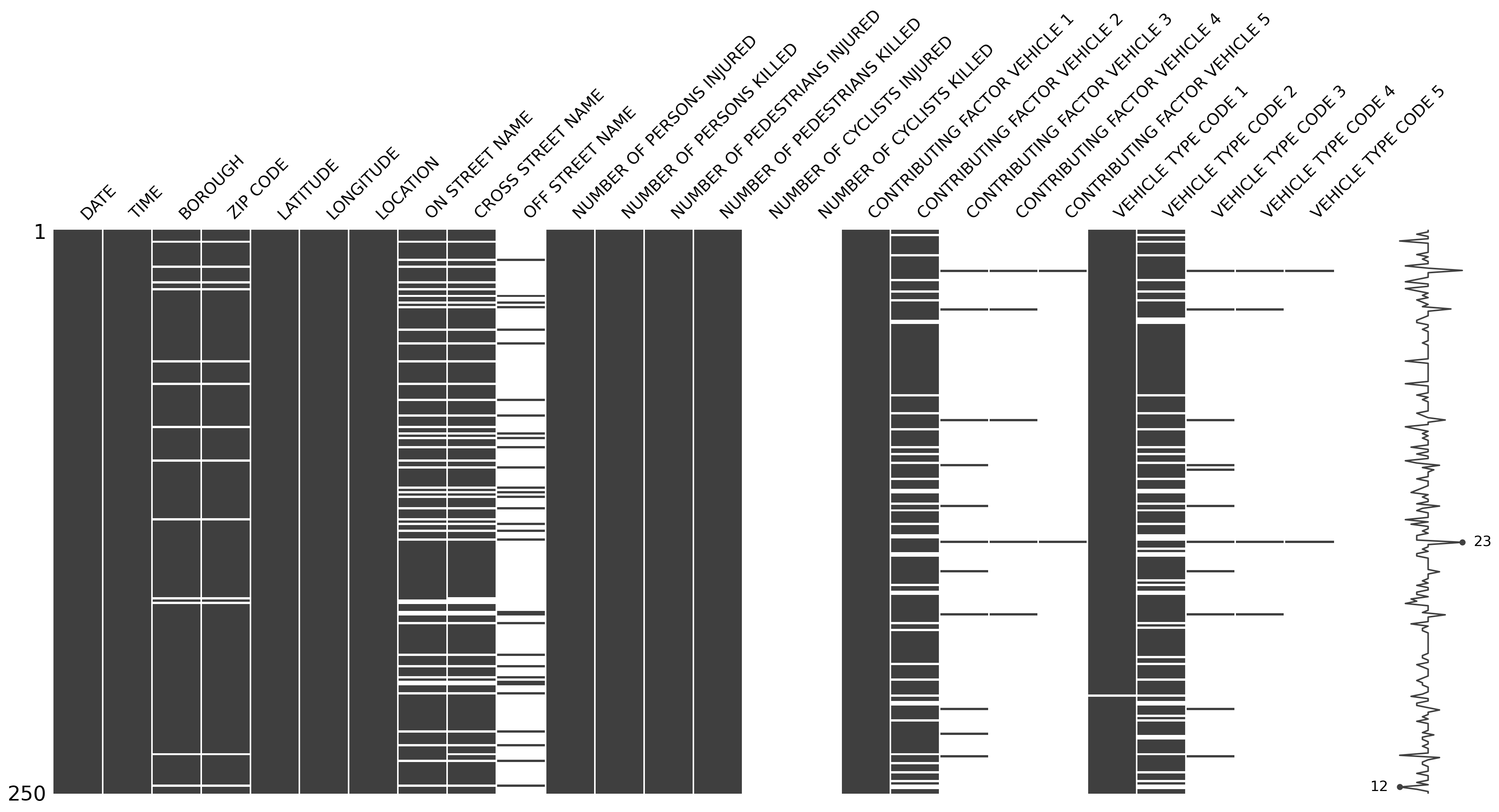 In the above visual, you may see that certain columns demonstrate more missingness than others. But that specific columns show patterns in missingness in comparison with that of other columns too. For example, in records where ON STREET NAME