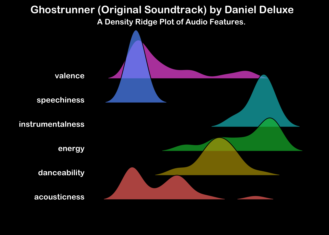 These ridge plots show a histogram of the mean audio feature values across each track in the album. Look across the horizontal axis at where the peaks for each feature occur. For example, if the album contains lots of tracks with busy vocals, the speechiness feature will show a peak to the right of the horizontal axis. Conversely, an instrumental album would have a speechiness peak to the left of the horizontal axis but you would also expect it to have a peak to the right of the axis in the instrumentalness feature.