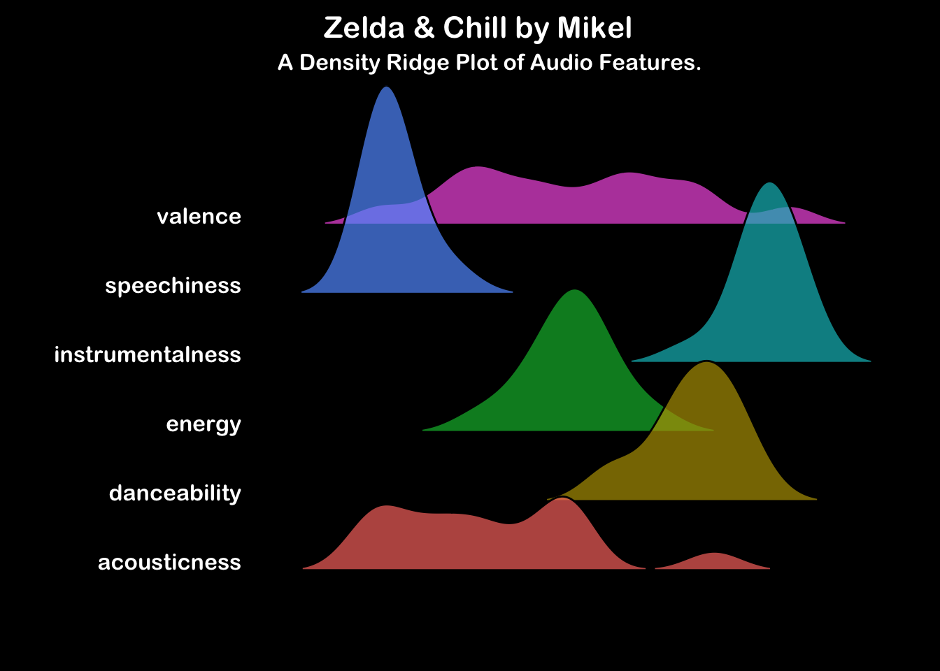 These ridge plots show a histogram of the mean audio feature values across each track in the album. Look across the horizontal axis at where the peaks for each feature occur. For example, if the album contains lots of tracks with busy vocals, the speechiness feature will show a peak to the right of the horizontal axis. Conversely, an instrumental album would have a speechiness peak to the left of the horizontal axis but you would also expect it to have a peak to the right of the axis in the instrumentalness feature.